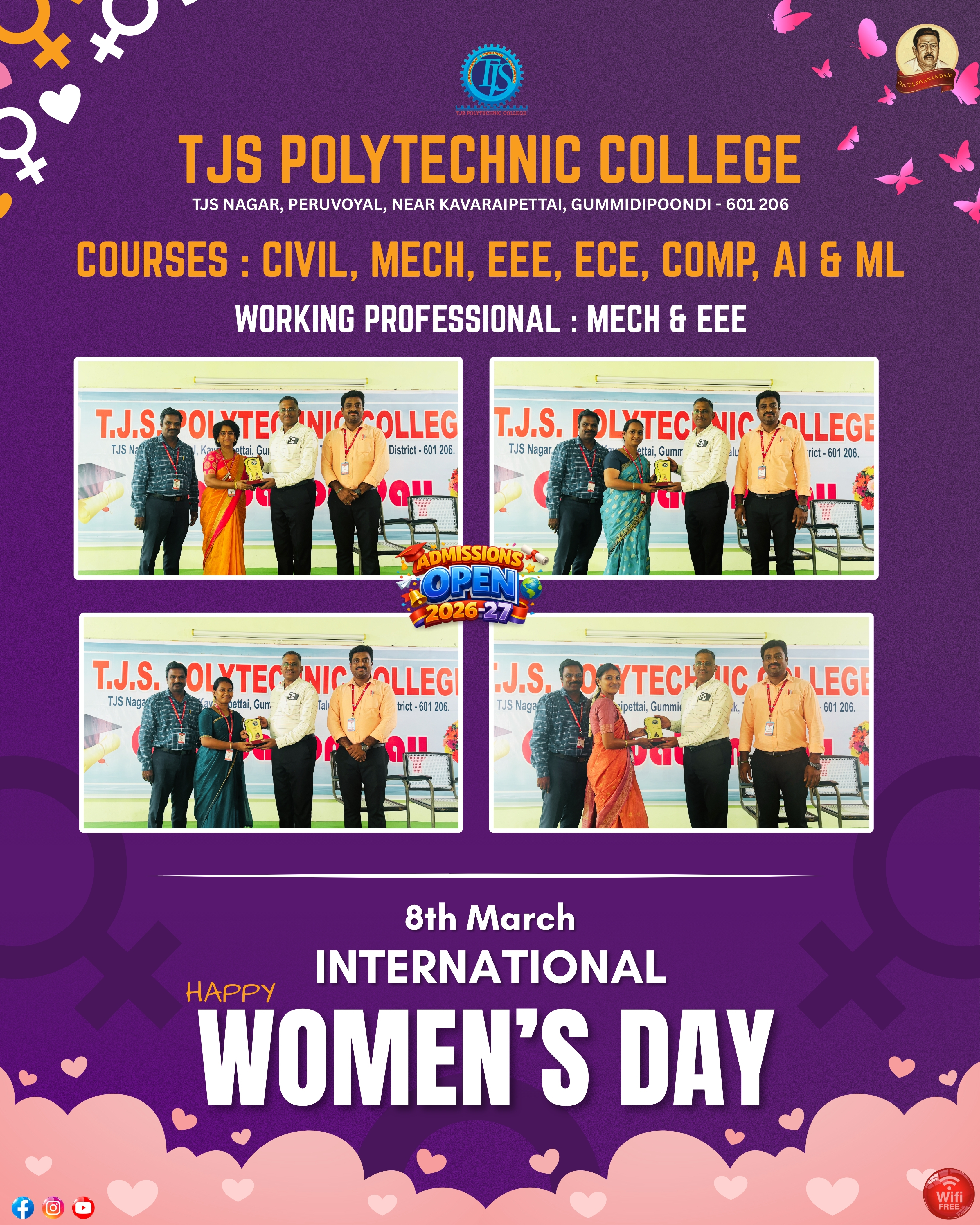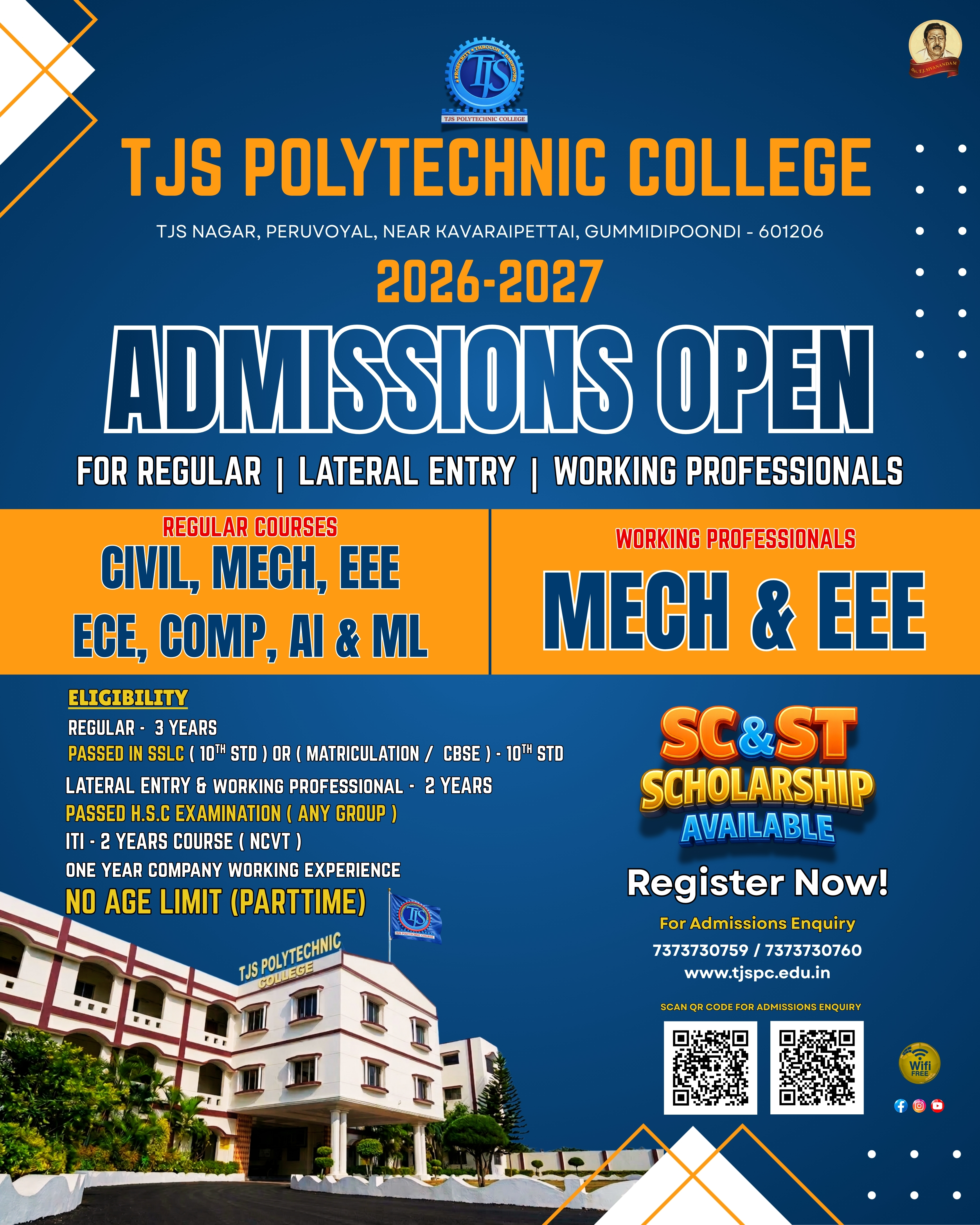 T.J.S Polytechnic College is a reputed institution in the field of technical education, dedicated to shaping skilled professionals for the modern industrial and technological world. Established in 2010, the college has been consistently contributing to technical education by offering career-oriented diploma programs that combine academic excellence with hands-on practical training.