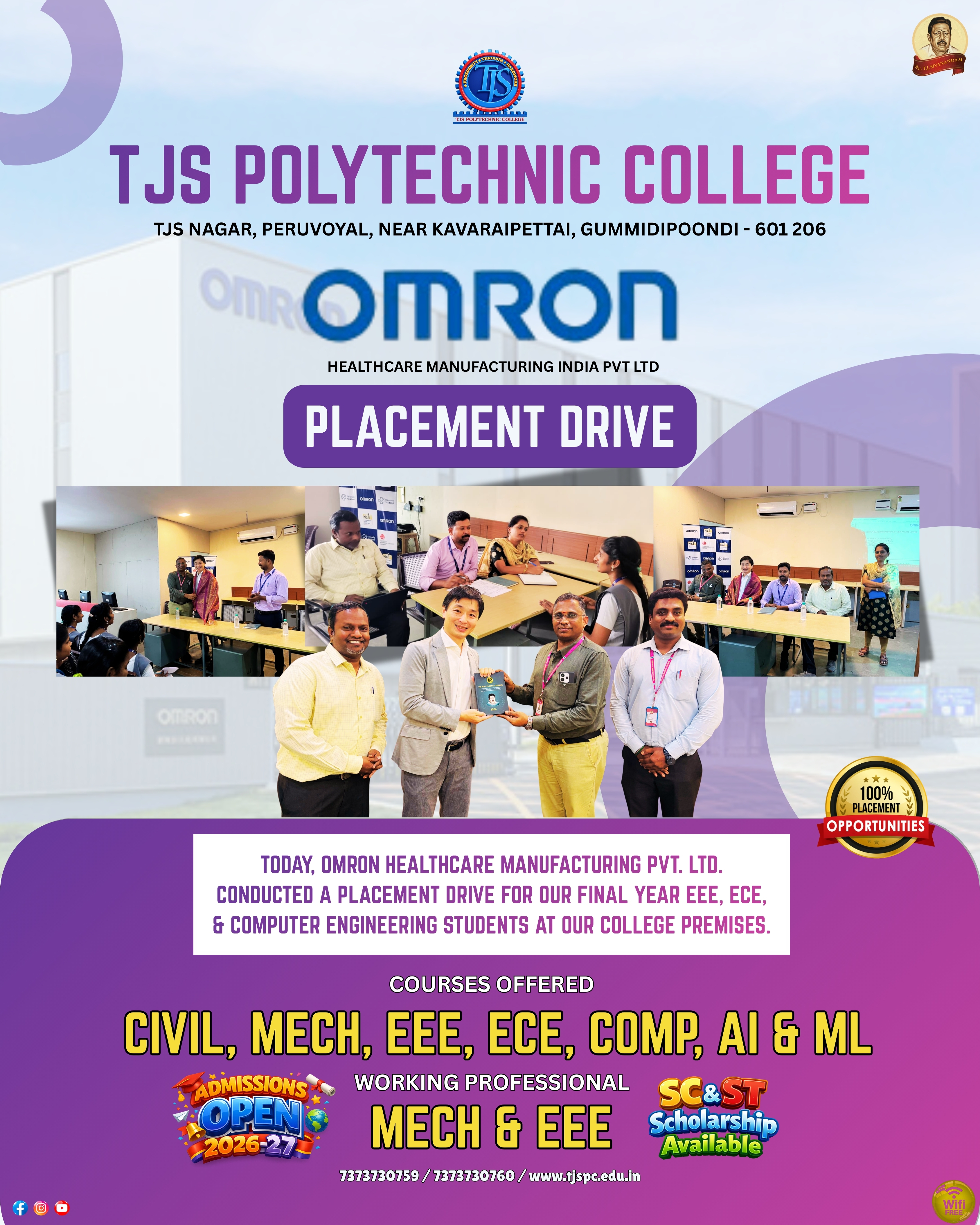 T.J.S Polytechnic College consistently achieves 100% Placements every year, reflecting the quality of training and industry relevance of its academic programs. Our students are recruited by top Multinational Companies (MNCs) and leading Original Equipment Manufacturers (OEMs), securing on-roll positions directly with reputed organizations.