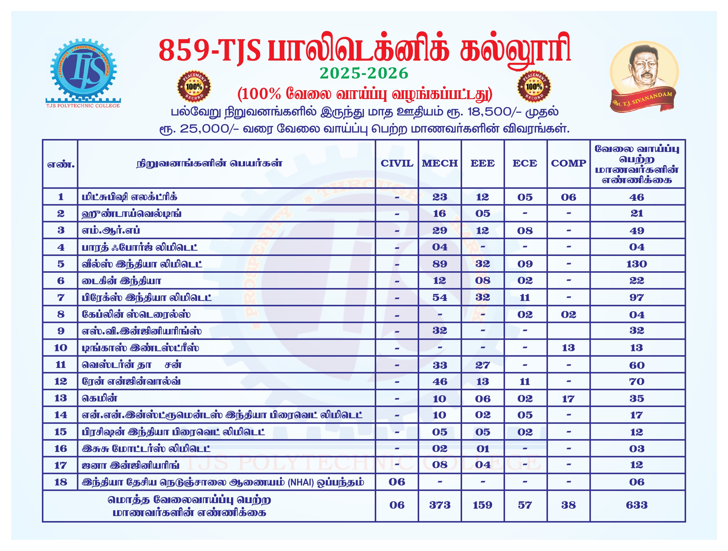 T.J.S Polytechnic College consistently achieves 100% Placements every year, reflecting the quality of training and industry relevance of its academic programs. Our students are recruited by top Multinational Companies (MNCs) and leading Original Equipment Manufacturers (OEMs), securing on-roll positions directly with reputed organizations.